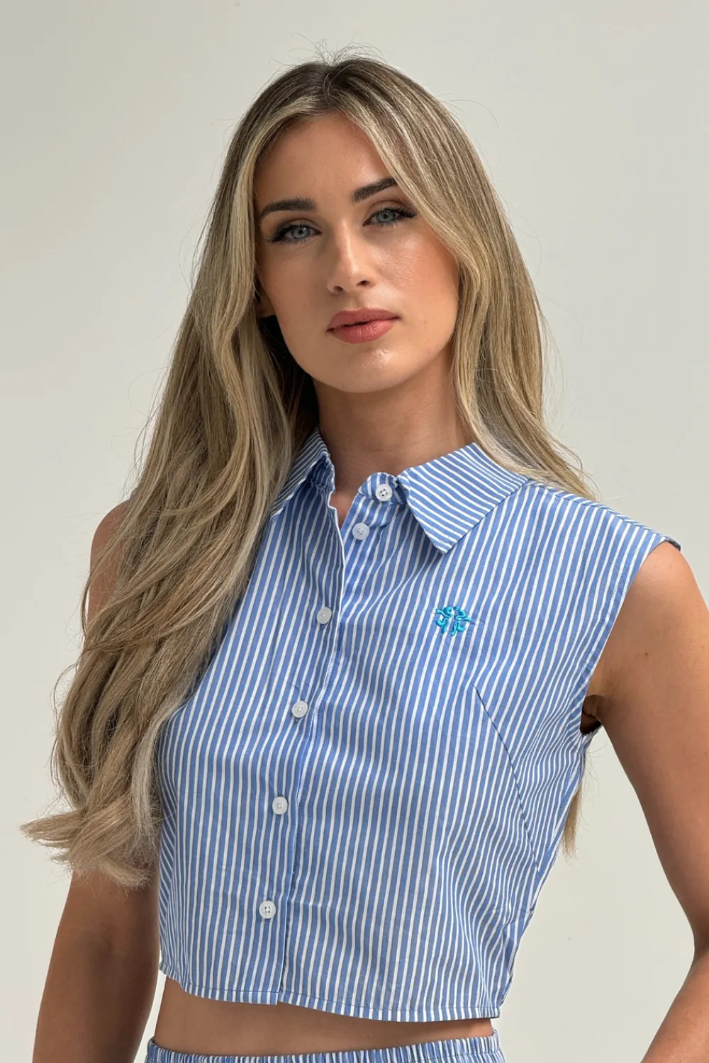 Expertly crafted with a button front and collar, the Sophia Pinstripe Two Piece in Blue is a stylish and versatile addition to your wardrobe. The elasticated waist and sleeveless design provide comfort, while the blue and white stripes add a touch of sophistication. Perfect for any occasion, this two piece set will elevate your look effortlessly.