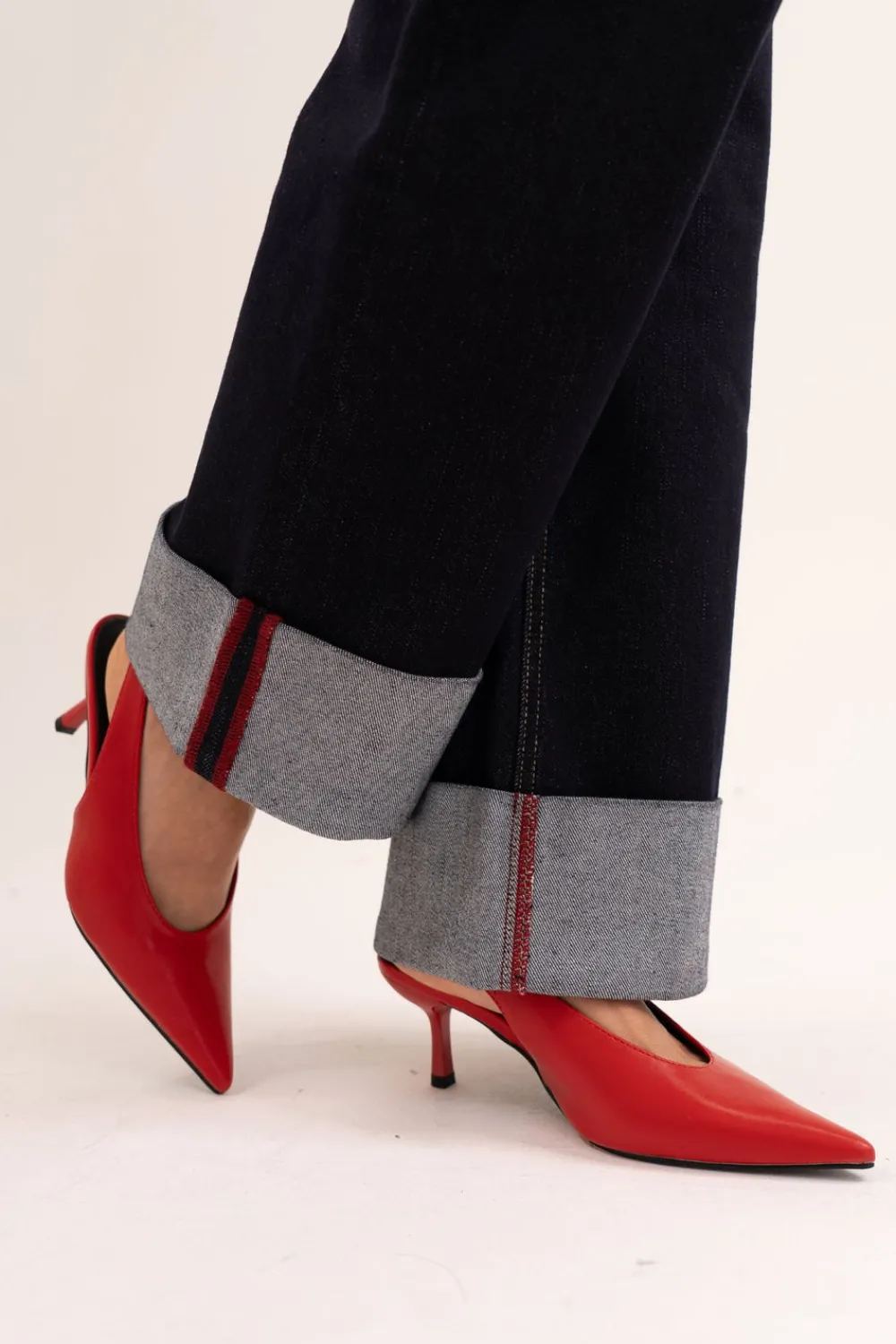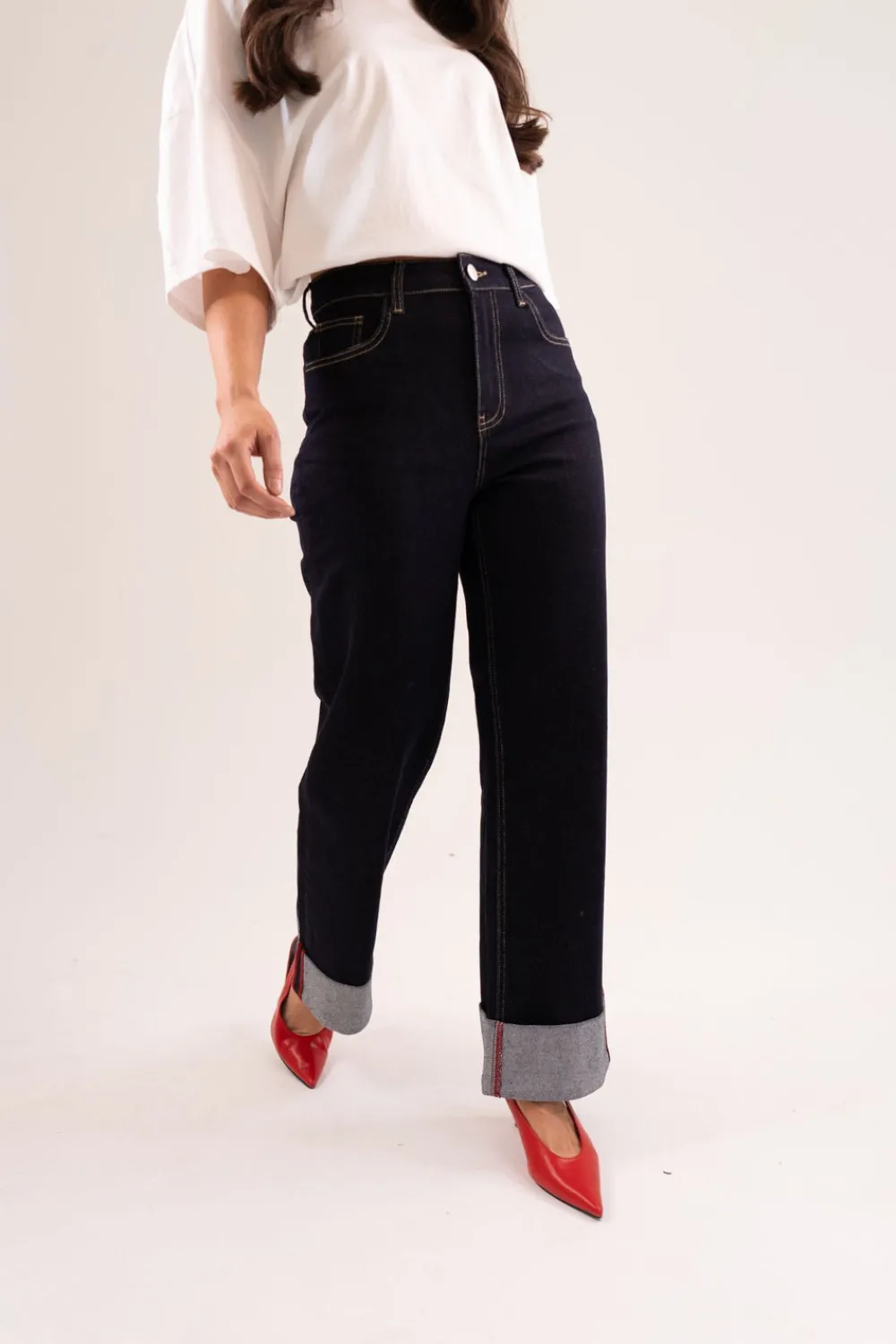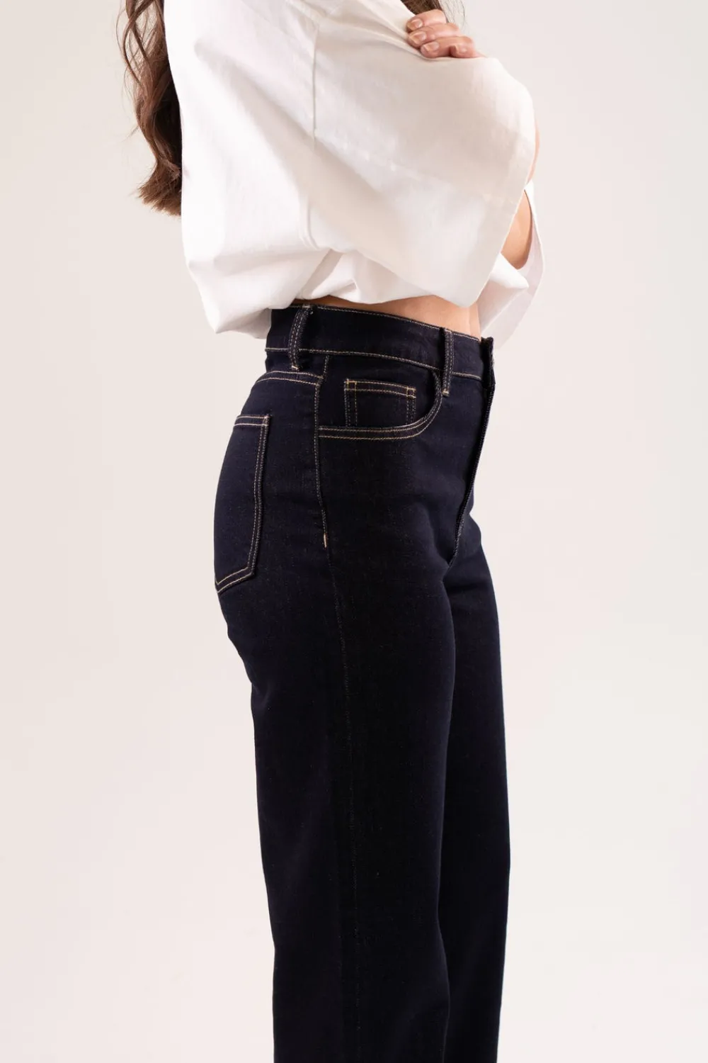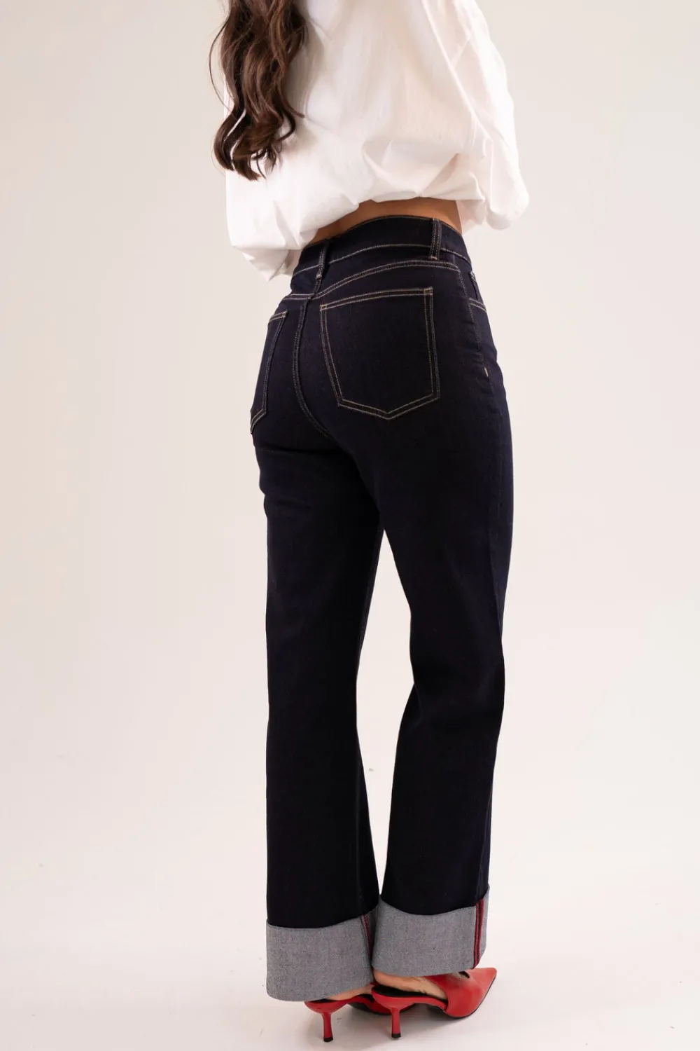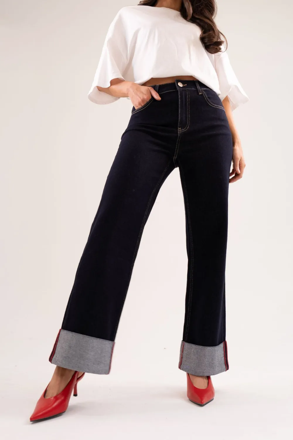 These Love Laura jeans in dark wash denim feature a high waist and wide leg for a modern, stylish look. The contrast red stitching adds a pop of colour to the classic dark wash, making these jeans a versatile addition to any wardrobe. Elevate your denim game with the latest Love Laura drop.