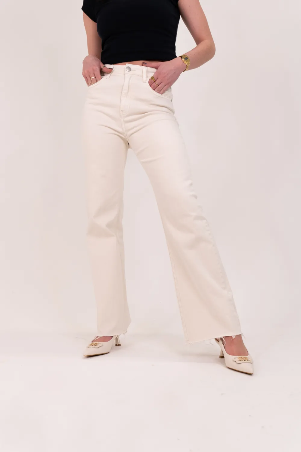 Expertly crafted with a high waist and stretch fabric, our Lynne Frayed Hem Wide Leg Jeans in Cream provide both comfort and style. The wide leg cut and frayed hem offer a modern touch, making these jeans a versatile addition to your wardrobe.