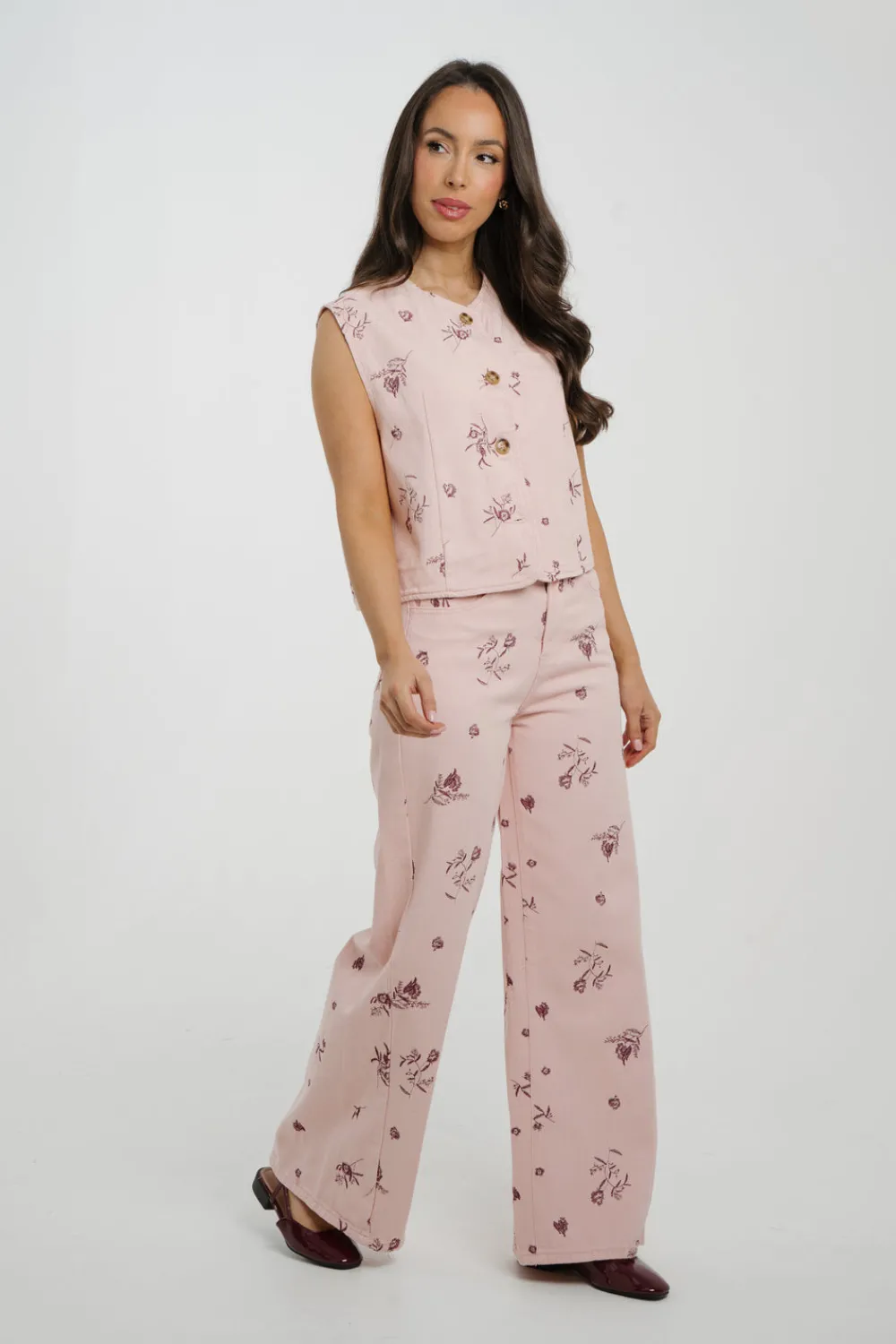 These Millie wide leg floral jeans in pink feature a high waist, a wide leg design, a zip and button front, and pockets for added functionality. The dark pink floral detailing adds a touch of femininity, and a matching waistcoat is also available for a complete look. Elevate your style with these chic and versatile jeans.